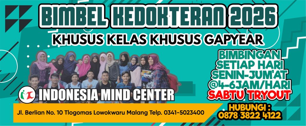 Bagi adik adik yang tahun ini belum lolos kedokteran ptn maupun jurusan lainnya, jangan berkecil hati. Daftarkan diri adik adik di Indonesia mind center sekarang juga. Selain pembelajaran yang menyenangkan, juga menerapkan protokol kesehatan yang di himbau pemerintah. Ayo persiapkan kemampuan adik adik sedini mungkin untuk menghadapi utbk snbt 2026 maupun ujian mandiri ptn. Khusus peserta luar kota tak perlu khawatir. Kami siapkan asrama gratis, asrama subsidi, hotel, catering, maupun laundry supaya adik adik dapat focus belajar untuk menghadapi utbk snbt.